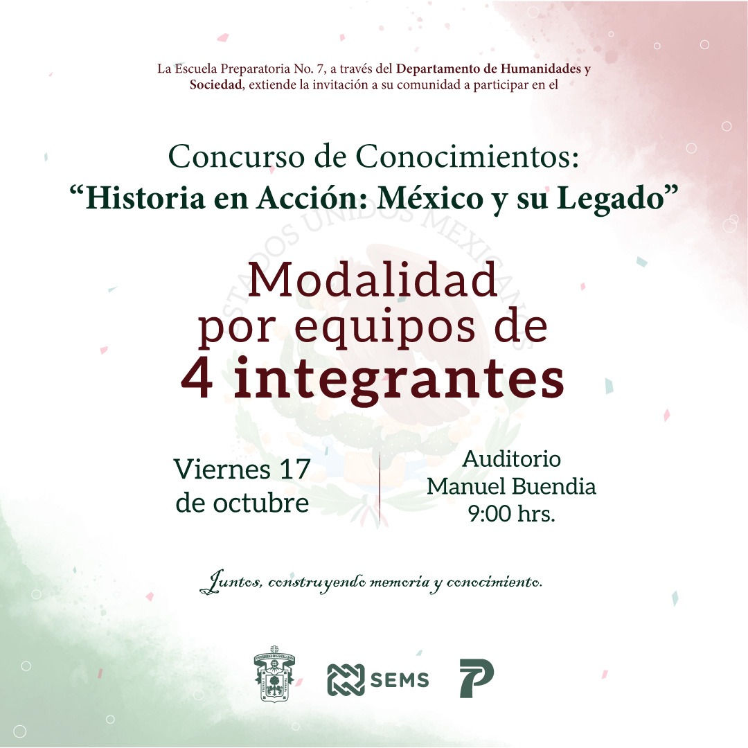 Concurso de Conocimientos: "Historia en Acción: México y su Legado" Modalidad por Equipos de 4 integrantes, estudiantes de 4to. y 5to. semestre de prepa 6 equipos en total. El propósito del concurso es favorecer en las y los estudiantes el desarrollo de habilidades de investigación, reflexión, análisis y argumentación de los sucesos históricos de nuestro país, propiciando en ellas y ellos que cuestionen y comprendan la realidad histórica y cultural de hoy. De tal forma que, se fortalezca su identidad nacional y valores cívicos. En este concurso académico sobre temas históricos relevantes será posible incentivar la formación crítica y aporte a la sociedad de parte de las y los estudiantes.