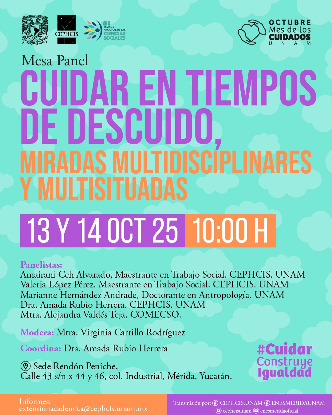En el marco de octubre, mes dedicado a los cuidados por parte de la UNAM, proponemos esta mesa que se efectuará en dos sesiones cuyo objetivo es presentar diversas perspectivas analíticas y empíricas en torno a la temática. Se ofrecerán algunos elementos para situar a los cuidados como trabajo que recae, principalmente, en las mujeres lo que exacerba la desigualdad de género y aviva la urgencia de dialogar y actuar hacia la corresponsabilidad.