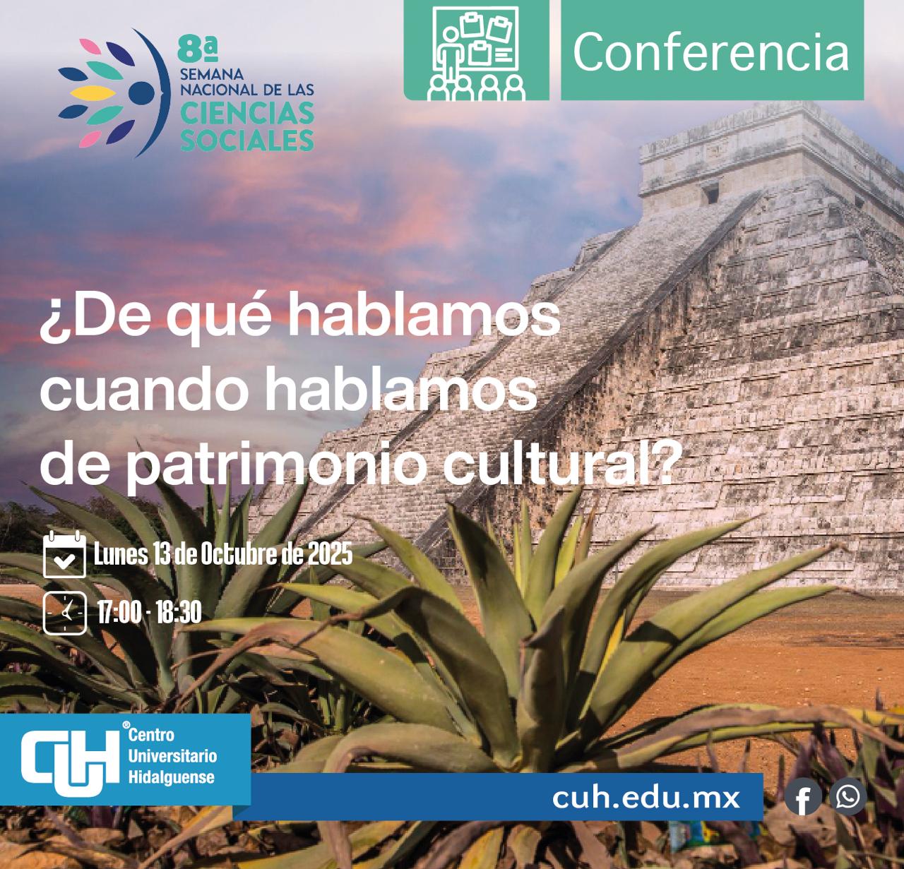¿De qué Hablamos Cuando Hablamos de Patrimonio Cultural? En el marco de la 8ª Semana Nacional de las Ciencias Sociales, el Centro Universitario Hidalguense, te invita a la conferencia “¿De qué Hablamos Cuando Hablamos de Patrimonio Cultural?”, un espacio para reflexionar sobre el significado, alcance y relevancia del patrimonio cultural en la sociedad contemporánea. Este evento busca generar un diálogo crítico y participativo, en el que podamos comprender cómo el patrimonio cultural contribuye a fortalecer la identidad y la cohesión social.