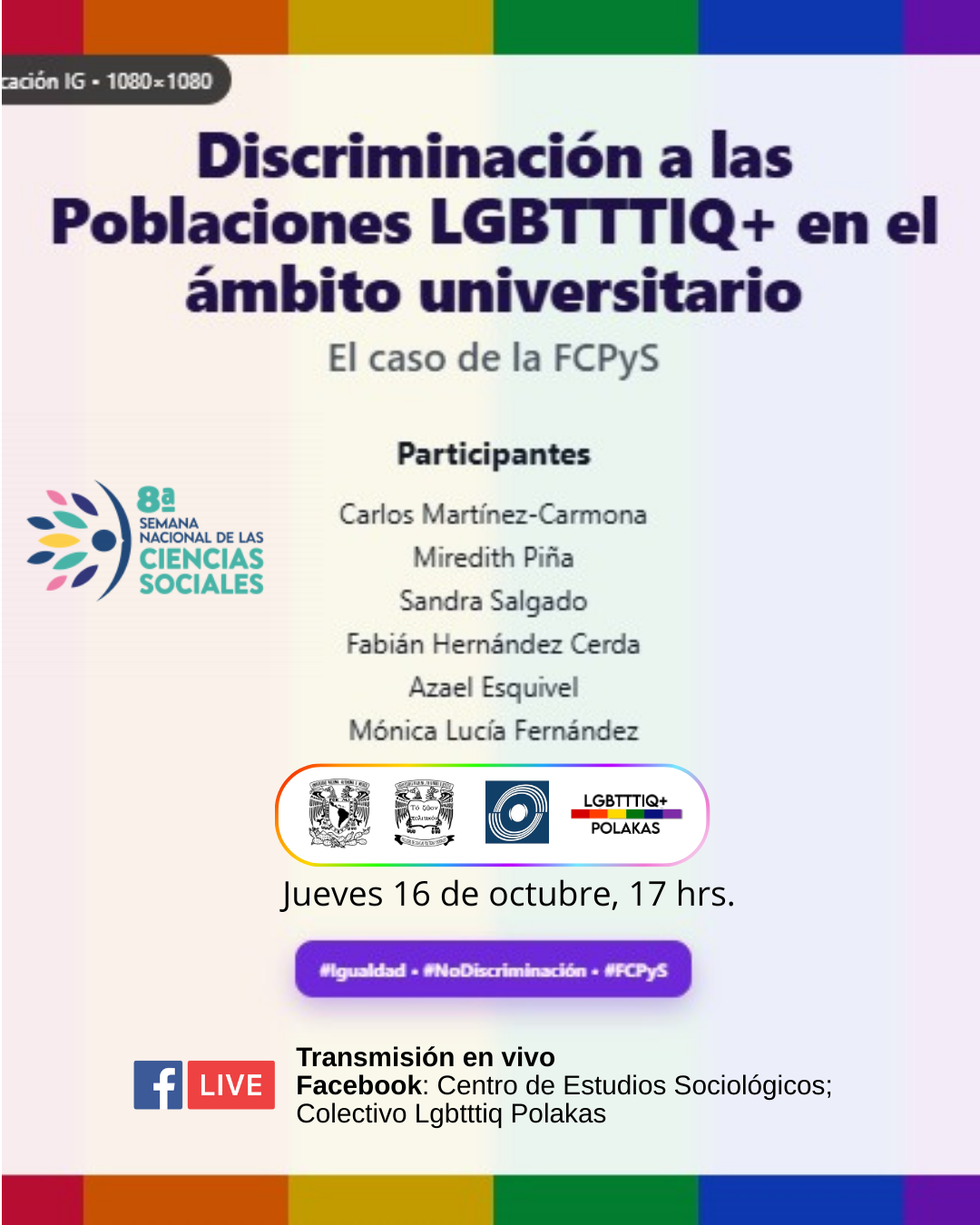 En contextos universitarios persisten prácticas de discriminación hacia personas LGBTTTI+, expresadas en violencias simbólicas, exclusión y omisiones institucionales. En la UNAM, los resultados de la Primera Consulta (2022) mostraron que 72.5% había sufrió algún tipo de discriminación por su identidad y orientación sexodiversa. Aún se sabe poco sobre cómo es que la discriminación se presenta en las diferentes facultades de la UNAM. Este Foro presenta los resultados de la Encuesta de Discriminación a las Poblaciones LGBTTTIQ+ de la FCPyS la cual se guía por cinco ejes temáticos que refieren a los temas de derechos, expresividad, interacciones sociales y acceso a servicios.