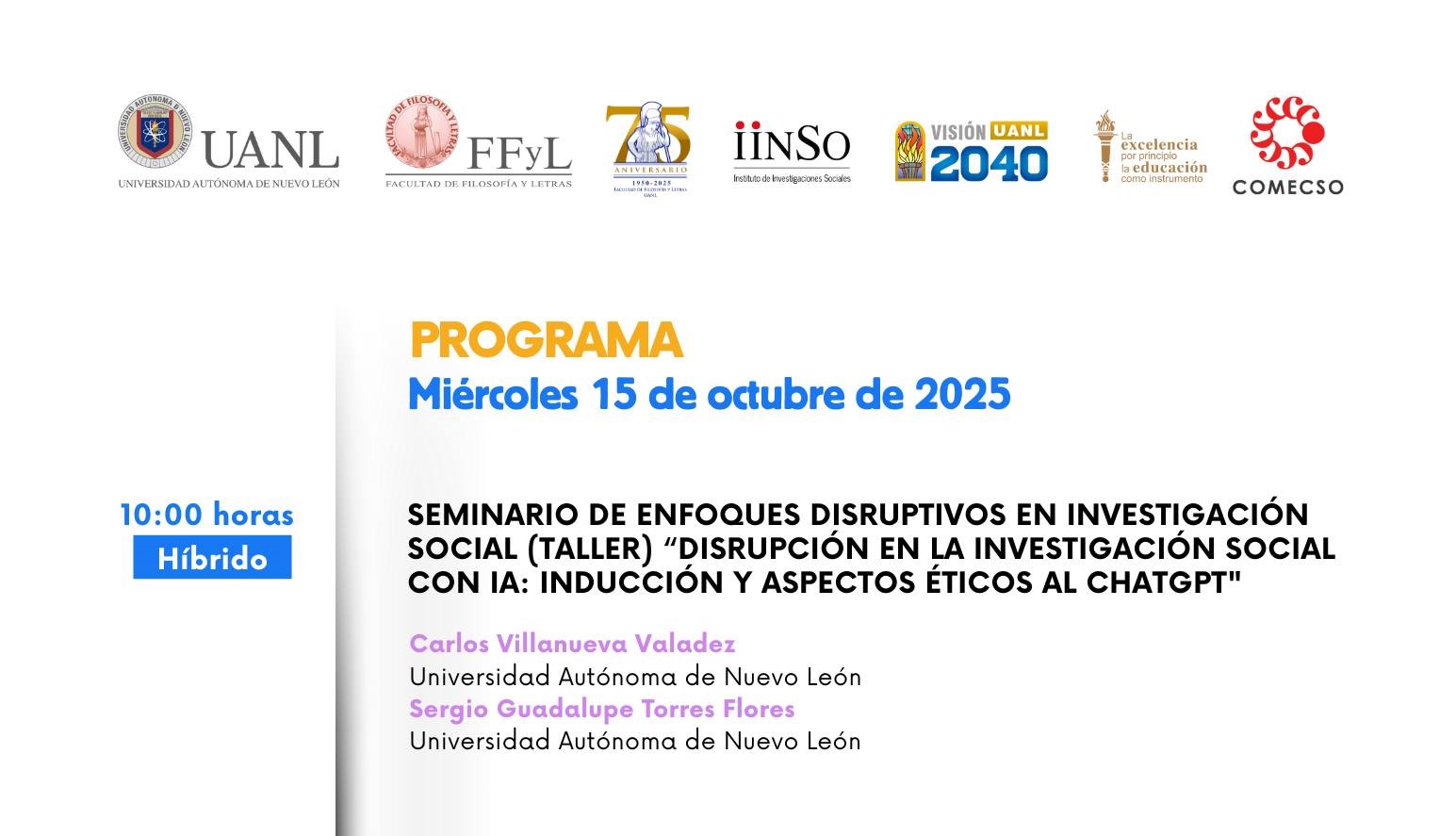 El Cuerpo Académico Géneros, aflicción, procesos de sanación y sustentabilidad del Instituto de Investigaciones Sociales de la UANL, realiza cada mes una sesión del Seminario en Enfoques Disruptivos para la Investigación Social. En el marco de la 8va Semana Nacional de las Ciencias Sociales, se llevará a cabo el taller "Disrupción en la Investigación Social con IA: inducción y aspectos éticos del ChatGPT". Es una actividad académica gratuita y abierta a todo el público interesado en el uso de la Inteligencia Artificial para la Investigación Social.