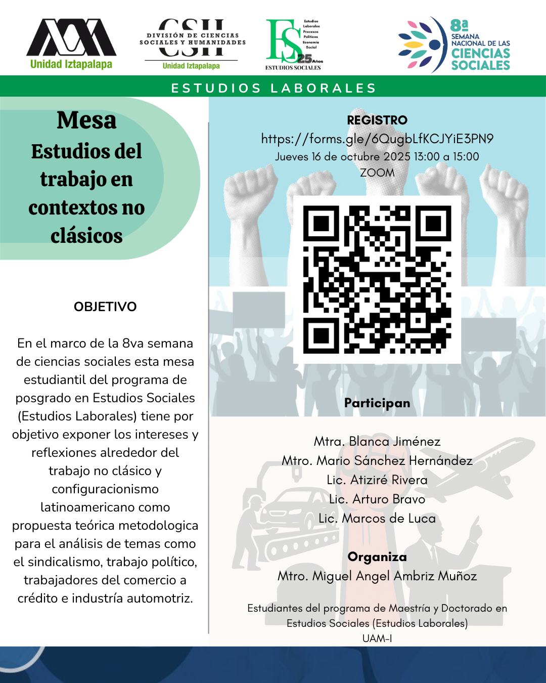 En el marco de la 8va semana de ciencias sociales esta mesa estudiantil del programa de posgrado en Estudios Sociales (estudios laborales) tiene por objetivo exponer los intereses y reflexiones al rededor del trabajo no clásico y configuracionismo latinoamericano como propuesta teórica metodologica en el análisis de temas como el sindicalismo, trabajo político, trabajadores del comercio a crédito e industría automotriz. Esta propuesta permitiría entablar canales de comunicación con personas academicas y público en general interesadas en el estudio del trabajo