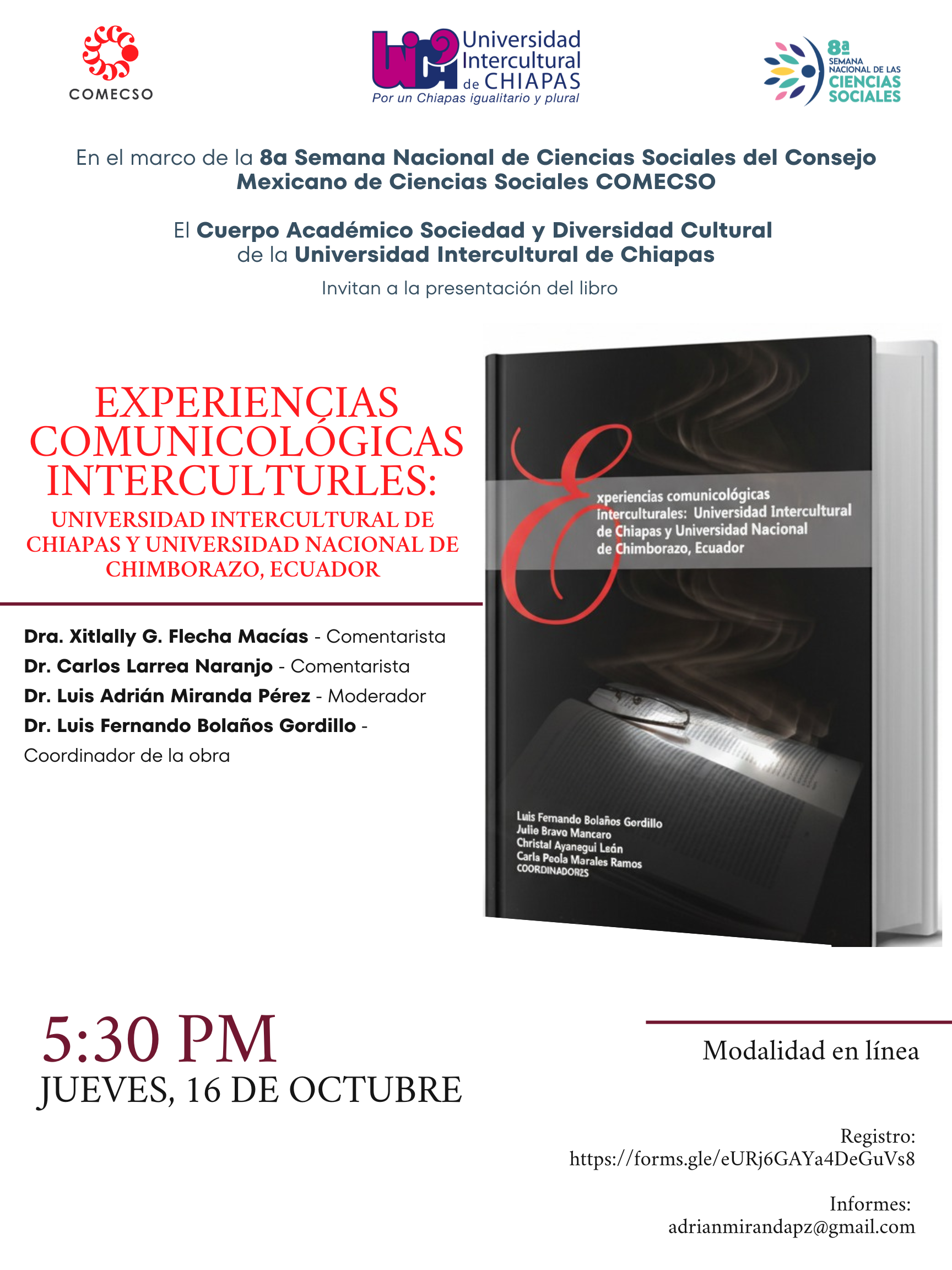 La presentación del libro "Experiencias comunicológicas interculturales: Universidad Intercultural de Chiapas y Universidad Nacional de Chimborazo, Ecuador" es una obra colectiva fruto del diálogo entre docentes y estudiantes, que explora temas vinculados con la comunicación, las artes, la educación, la autonomía y el género. Desde una perspectiva de interculturalidad crítica y pensamiento decolonial, el libro se inspira, por ejemplo, en la obra de Bolívar Echeverría para analizar el devenir de la educación superior latinoamericana. La actividad se realizará en modalidad en línea el jueves 16 de octubre del 2025 a las 5:30 pm.