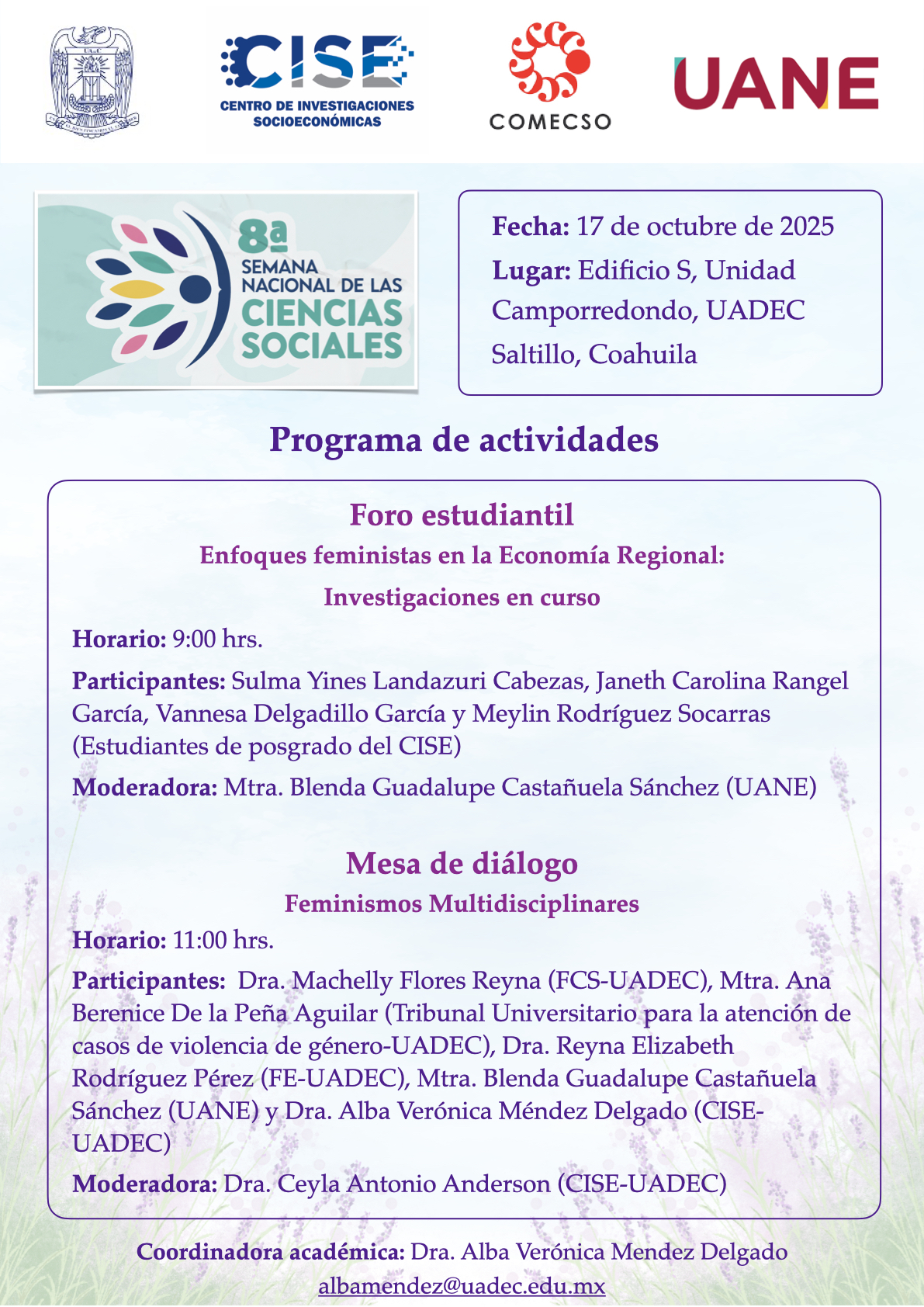 Actividad compuesta por un foro estudiantil y una mesa de diálogo sobre feminismos multidisciplinares. Participan estudiantes y profesoras de la UAdeC y UANE. El foro reúne investigaciones con enfoque de economía feminista; la mesa, experiencias docentes desde disciplinas como economía, sociología, psicología e historia. El objetivo es fomentar el diálogo intergeneracional y multidisciplinario en torno a los feminismos en las ciencias sociales.