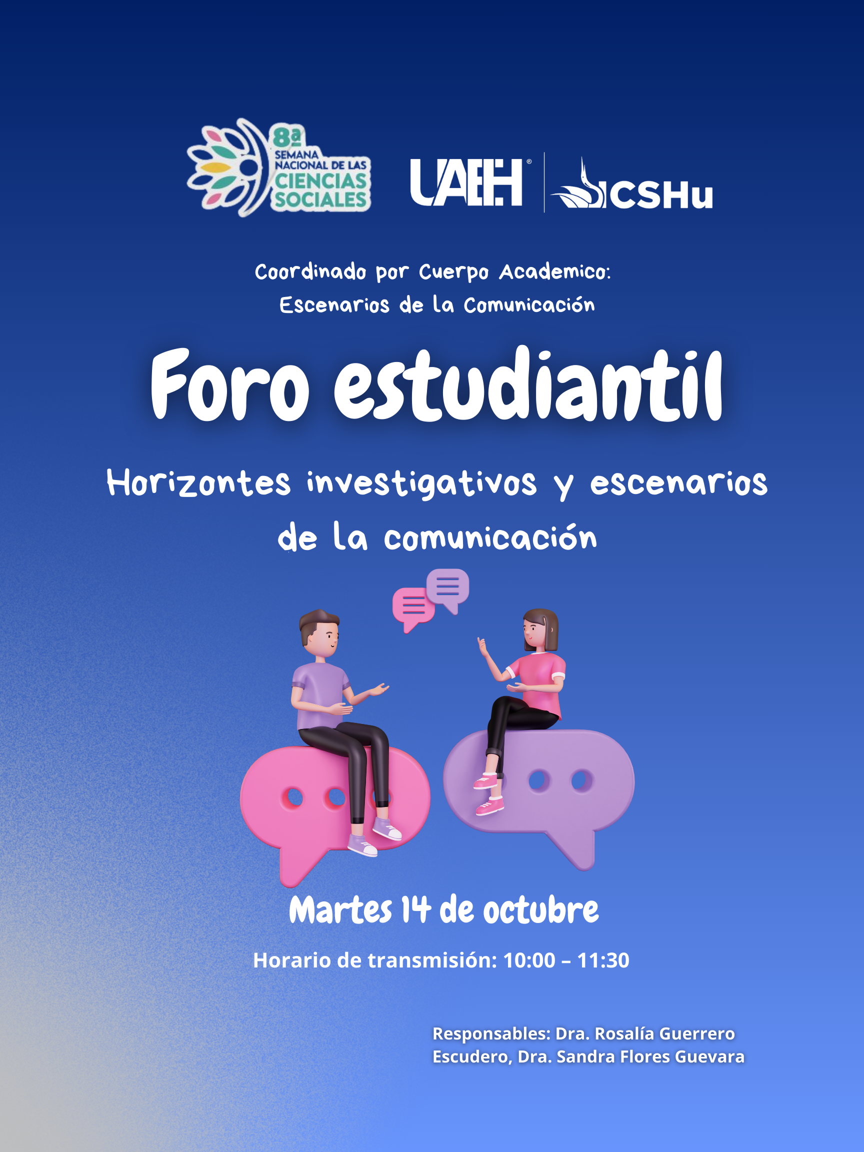 El foro estudiantil “Horizontes investigativos y escenarios de la comunicación”, con la participación de la Dra. Rosalía Guerrero Escudero y la Dra. Sandra Flores Guevara, se llevará a cabo de 10:00 a 11:30 hrs en el ICSHU. La actividad busca generar un espacio de diálogo con estudiantes para reflexionar sobre los retos y oportunidades de la investigación en comunicación, así como los diversos escenarios donde esta disciplina cobra relevancia. A través de la interacción con las ponentes, los asistentes podrán enriquecer sus perspectivas, plantear inquietudes y fortalecer su interés por la construcción de conocimiento en el campo comunicativo.