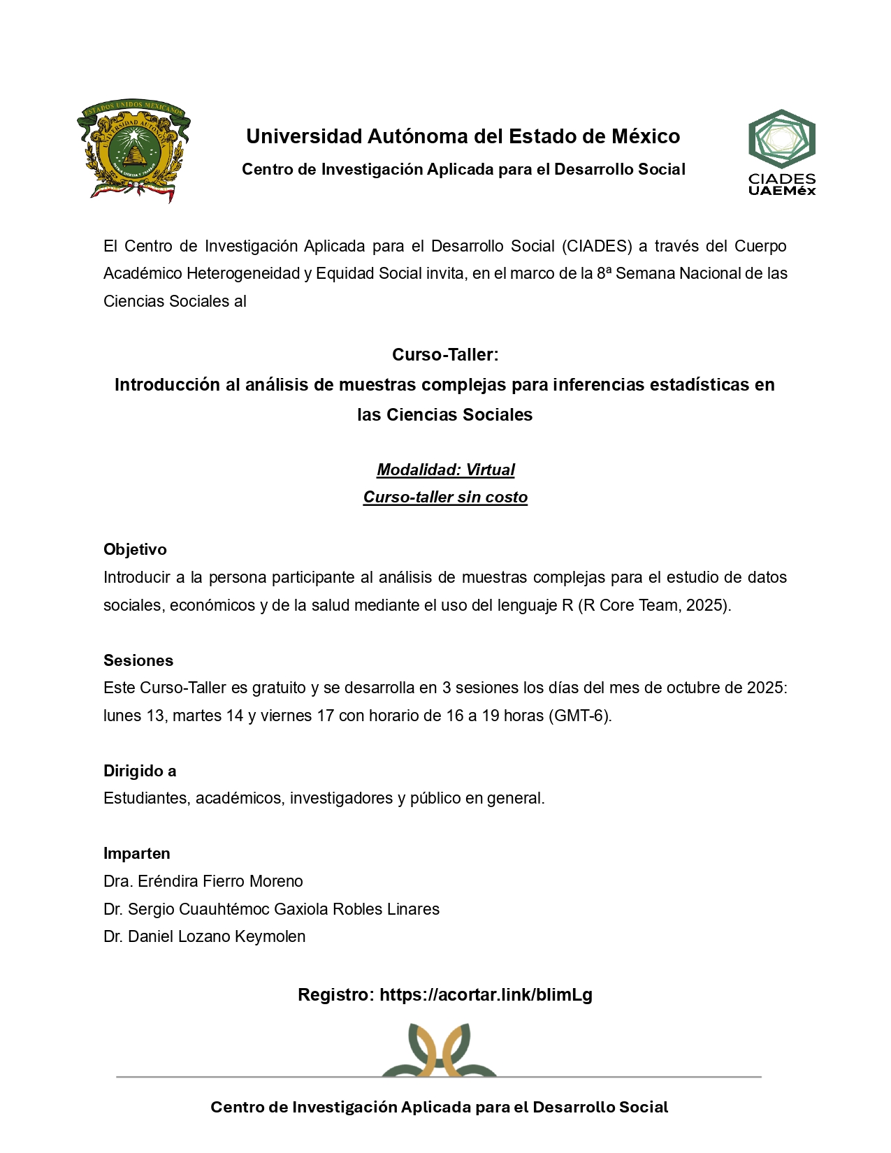 Este Curso-Taller no tiene costo y está dirigido a todo público que estén interesado en el manejo estadístico de datos obtenidos mediante diseños muestrales complejos.