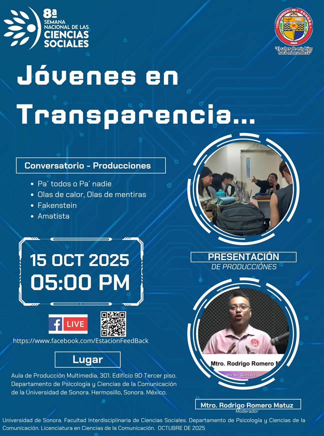 Aula de Producción Multimedia, 301. Edificio 9D Tercer piso. Departamento de Psicología y Ciencias de la Comunicación de la Universidad de Sonora. Hermosillo, Sonora. México.
