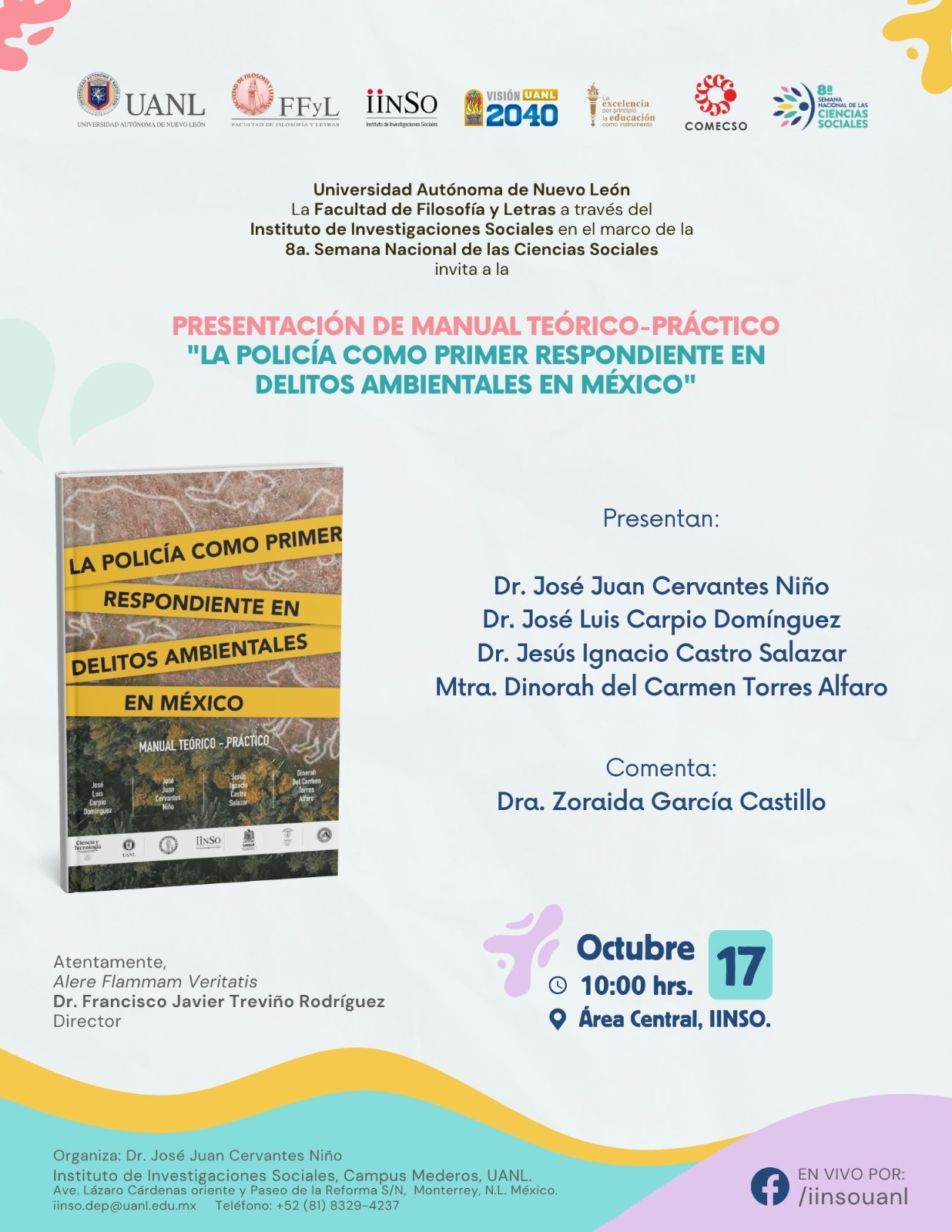 En el presente evento se presentará el manual "La Policía Como Primer Respondiente en Delitos Ambientales en México. Manual Teórico-Práctico" el cual, será comentado por la y los autores para presentarlo como una herramienta útil para los elementos de seguridad pública en México en la identificación y atención de las distintas formas de daño ambiental tipificadas como delitos en el fuero federal.