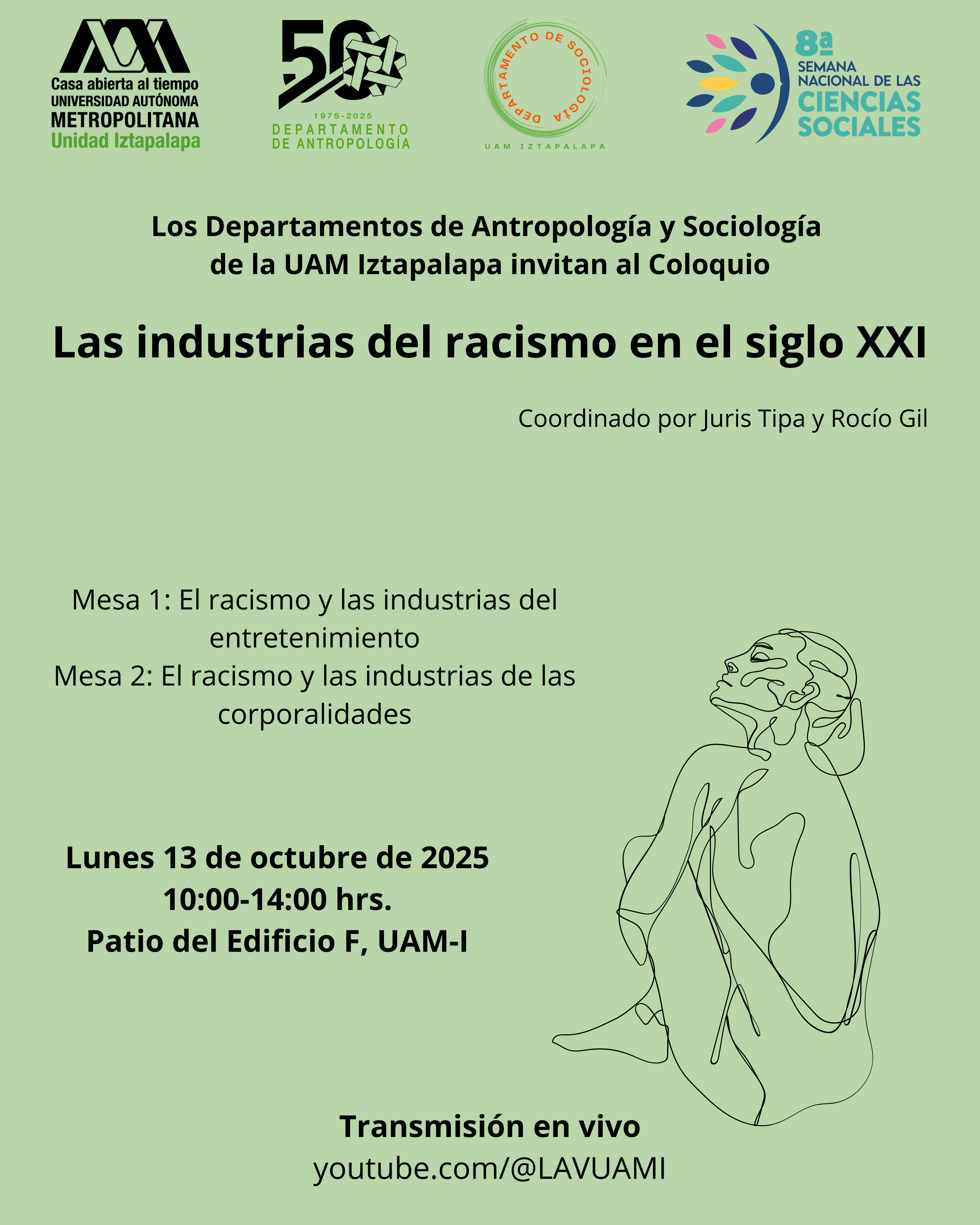 El objetivo del Coloquio es difundir los hallazgos y los resultados de distintos estudios hechos sobre la dimensión macro o estructural del racismo que está presente en distintas industrias culturales y, por ello, tiene directa incidencia en el nivel micro del racismo o el cotidiano-subjetivo. Entre las dos mesas del Coloquio se abordarán diferentes aspectos implícitos y explícitos del racismo en la industria del entretenimiento como los memes, las plataformas, el cine y el teatro; y en la de las corporalidades a través de los temas del modelaje, los productos cosméticos y las cirugías estéticas.