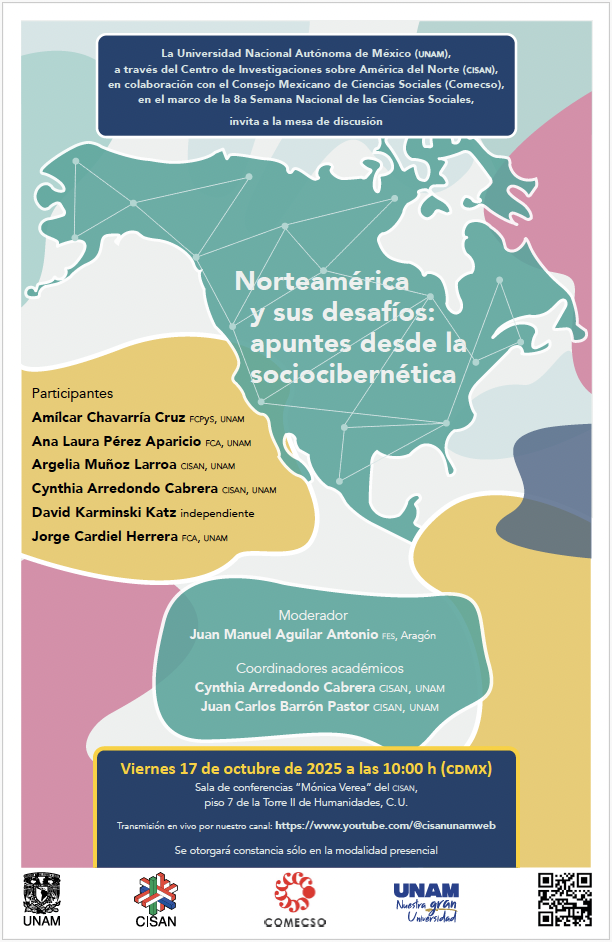 En el marco de los trabajos del “Seminario permanente de Sociocibernética crítica aplicada al estudio de América del Norte” del Centro de Investigaciones sobre América del Norte (CISAN), UNAM, se presentará una serie de ponencias de los miembros actuales con los avances y reflexiones sobre la aplicabilidad de la sociocibernética crítica como perspectiva teórico- metodológica. Al ser un seminario interdisciplinario, los miembros provienen de distintos espacios y enfoques teóricos lo que ha enriquecido la discusión teórica y metodológica, aunque siempre centrados en los asuntos de Norteamérica como región. A lo largo de los seis años de trabajo, el seminario ha abordado temas tan amplios que van desde una crítica al modelo neoliberal, el sistema internacional, el medioambiente, la perspectiva de género, los medios de comunicación, los memes, entre muchos otros, asimismo se ha realizado una amplia revisión de autores centrales de la sociocibernética crítica.