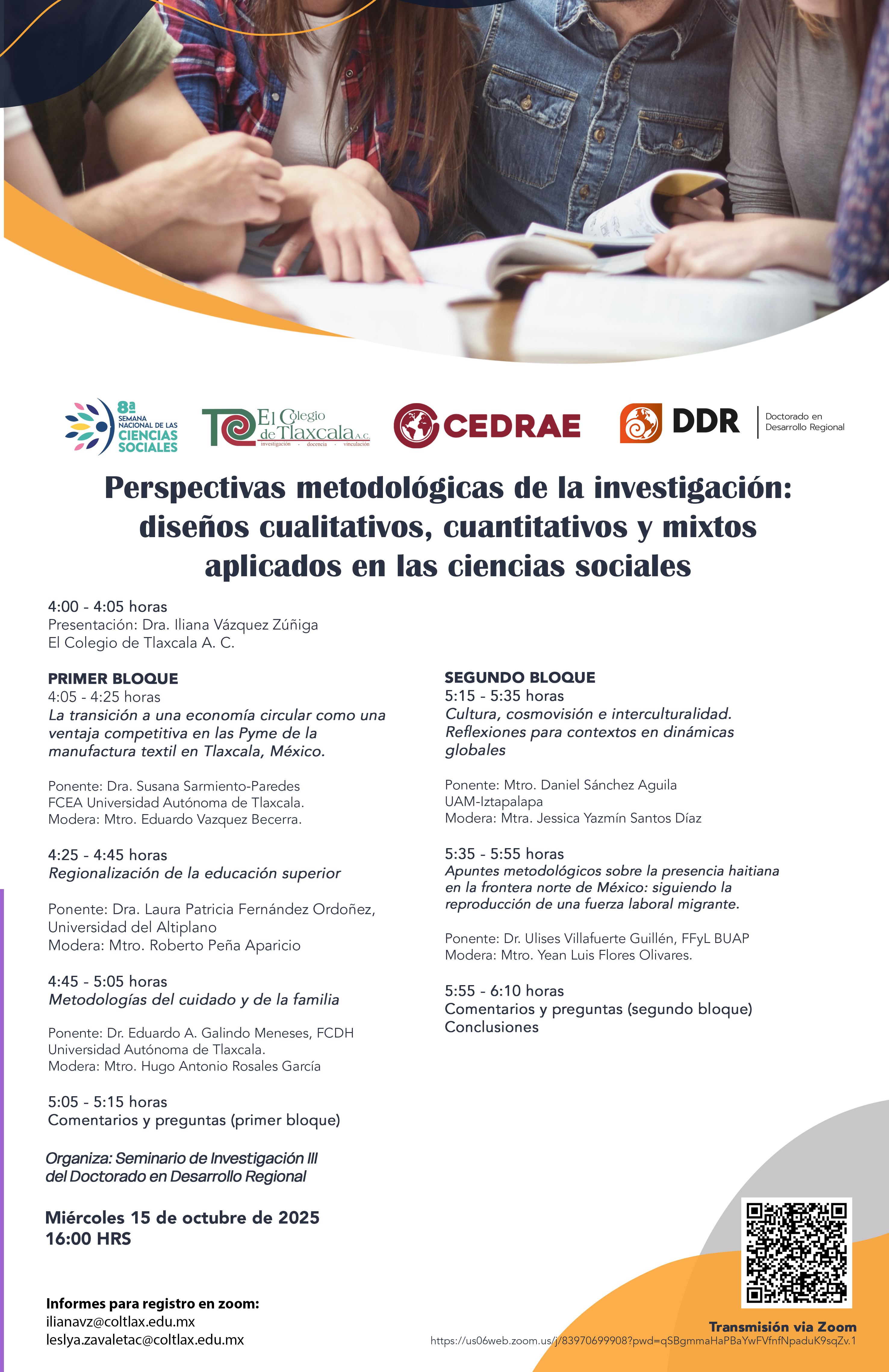 El objetivo de esta actividad es ser un espacio de encuentro y diálogo sobre los procesos de investigación en ciencias sociales, con énfasis en la construcción de diseños metodológicos y sus particularidades cualitativas, cuantitativas y mixtas. Los convocantes son integrantes del Seminario de Investigación III del Doctorado en Desarrollo Regional de El Colegio de Tlaxcala, quienes están en la revisión teórica metodológica de su trabajo investigativo. Los invitados expondrán las estrategias, técnicas e instrumentos que han implementado en sus investigaciones con el fin de compartir sus experiencias y mostrar el cómo de la producción de conocimiento científico en las ciencias sociales.