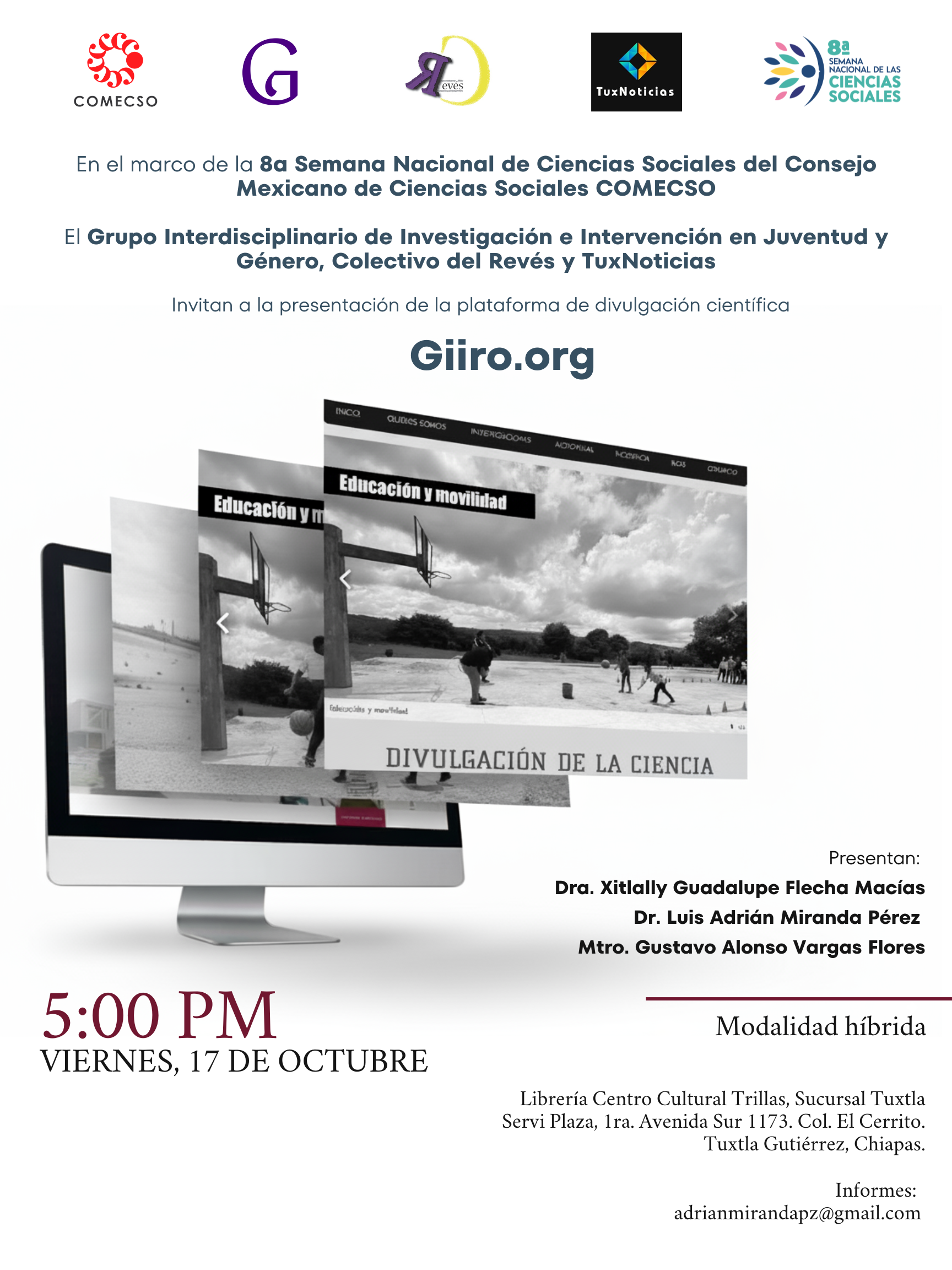 Giiro.org es una plataforma digital de divulgación científica que nace desde el Sur, con la convicción de que el conocimiento y la acción son herramientas esenciales para transformar los territorios. Su objetivo es acercar las ciencias sociales al público general, mostrando proyectos de investigación, experiencias de formación y acciones de vinculación que dialogan con las realidades locales y globales. En este espacio, la investigación se presenta de manera accesible, acompañada de recursos visuales y narrativos que permiten comprender cómo los saberes se conectan con la vida cotidiana y las transformaciones sociales.
