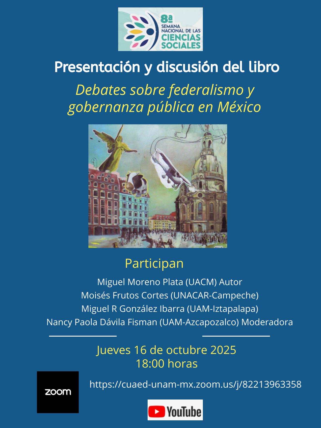 El objetivo de este evento es presentar y discutir sobre los ejes y líneas de investigación del libro Debates sobre federalismo y gobernanza pública en México, coordinado por Miguel Moreno Plata. La obra integra por una compilación de capítulos especializados desde diversas metodologías multidisciplinarias e interdisciplinarias en el campo de las ciencias políticas y sociales. El libro se articula en tres ejes temáticos transversales vinculados con el funcionamiento del sistema federal y el estudio de la administración pública mexicana y el sistema de partidos políticos con especial referencia a la alternancia presidencial de 2018.