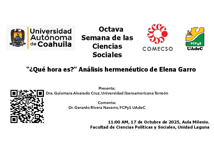Este conversatorio implica un acercamiento a la obra feminista de Elena Garro, tomando en cuenta los elementos que proporciona la hermenéutica literaria. Están invitados a encontrar los vacíos textuales que la autora ha dejado deliberadamente (¿o no?) en el cuento "¿Qué hora es?" de su extraordinario libro "La Semana de Colores."
