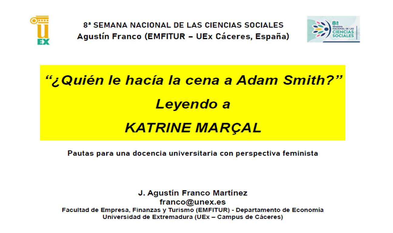 Conferencia sobre una actividad práctica para alumnado universitario basada en una lectura de un libro de crítica feminista de la teoría económica convencional. El libro se titula “¿Quién le hacía la cena a Adam Smith?” de Katrine Marçal. Siendo los objetivos principales: Fomentar la pedagogía universitaria con enfoque feminista. Reflexionar sobre el papel de las mujeres en el desarrollo de la ciencia económica. Impulsar acciones de sensibilización sobre una pedagogía basada en la coeducación. Sensibilizar sobre la dimensión social y de género del aprendizaje crítico. Promover grupos de estudio y redes de investigación en docencia feminista.