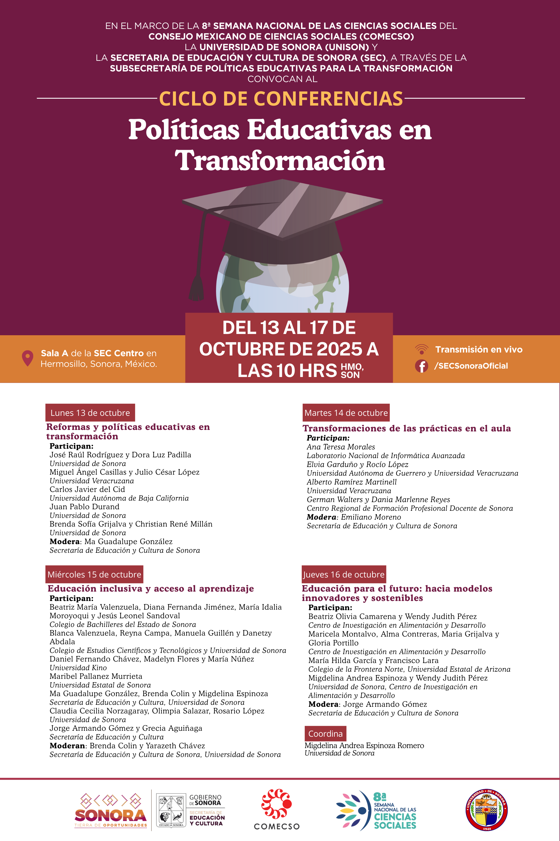El ciclo de conferencias "Políticas Educativas en Transformación" se enmarca en los ejes prioritarios de la Nueva Escuela Mexicana (NEM), impulsando el análisis crítico y la reflexión colectiva sobre los cambios y retos en la educación nacional. A través de la participación de especialistas, docentes y tomadores de decisiones, se abordarán temas como inclusión, equidad, excelencia, pertinencia curricular y formación integral, con el objetivo de fortalecer prácticas educativas que respondan a las necesidades del contexto actual y promuevan una educación humanista, democrática y con justicia social.
