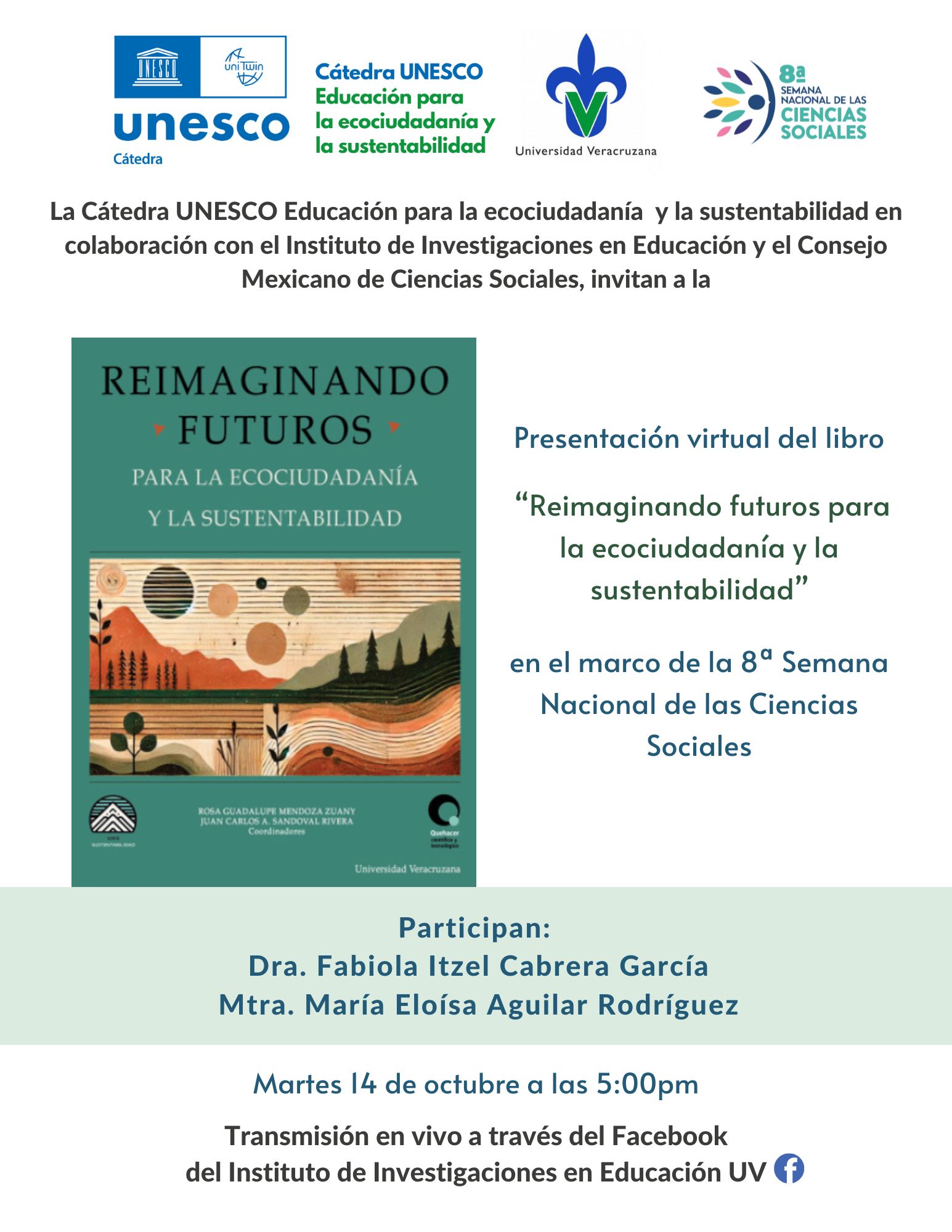 La presentación del libro Reimaginando futuros para la ecociudadanía y la sustentabilidad (Mendoza Zuany, R. G., et al., 2025, Editorial Universidad Veracruzana) reúne a la Dra. Fabiola Itzel Cabrera García y a la Mtra. María Eloísa Rodríguez Aguilar en un diálogo sobre los retos y posibilidades de construir justicia socioecológica, el papel de la academia en visibilizar y transformar las desigualdades, y la importancia de construir horizontes de ecociudadanía y sustentabilidad desde las instituciones educativas; el evento incluye la presentación de la obra, una reflexión guiada por preguntas eje y un espacio de intercambio con el público, con una duración aproximada de 50 minutos.