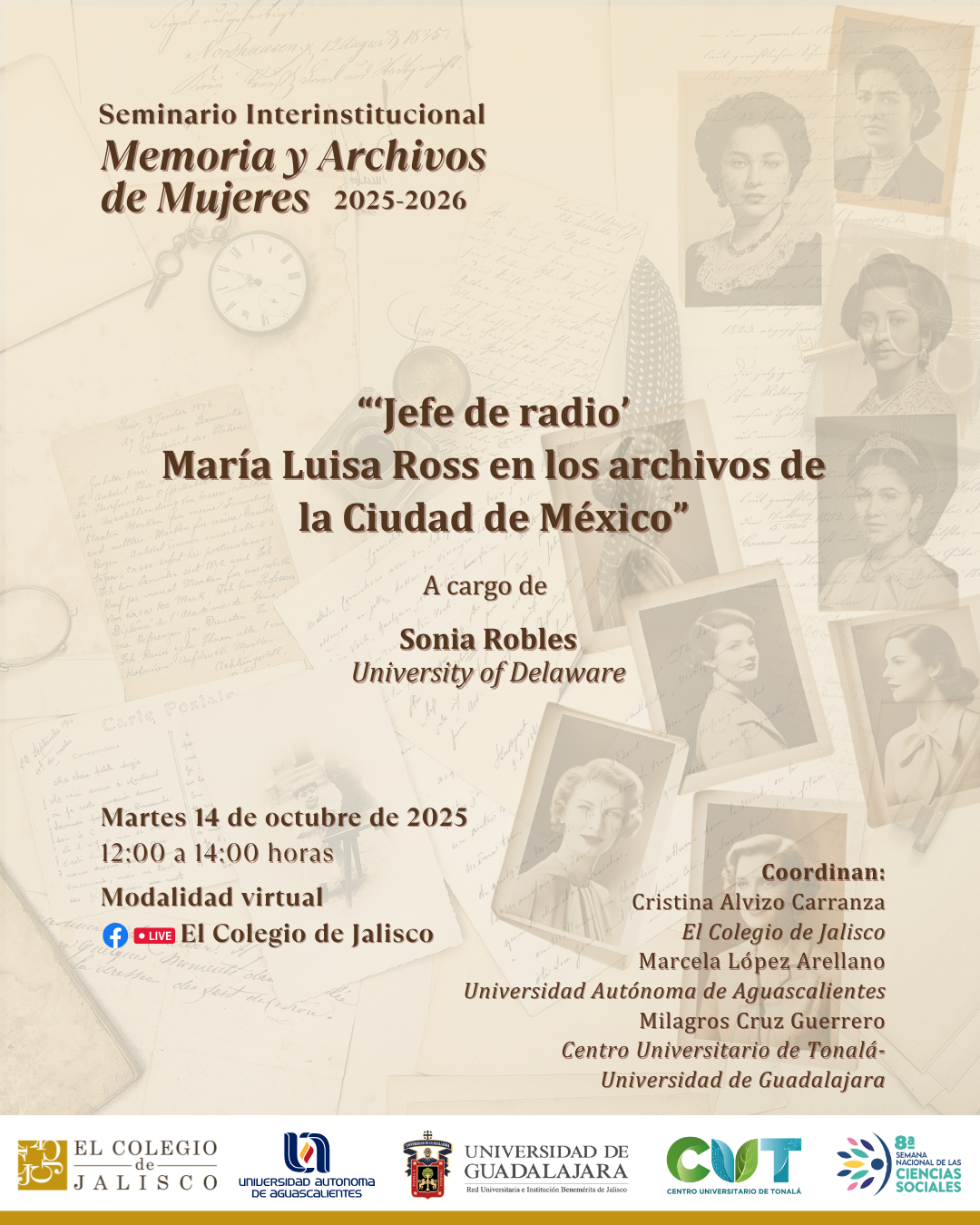 Este seminario tiene la finalidad de conocer las experiencias de historiadoras con los archivos de mujeres o sobre mujeres, tanto personales como institucionales, que hayan localizado, rescatado, organizado, consultado o incorporado a instituciones. El Seminario es un espacio abierto al público para compartir reflexiones desde lo metodológico, lo teórico y el valor de los archivos para hacer visibles las vidas de las mujeres.