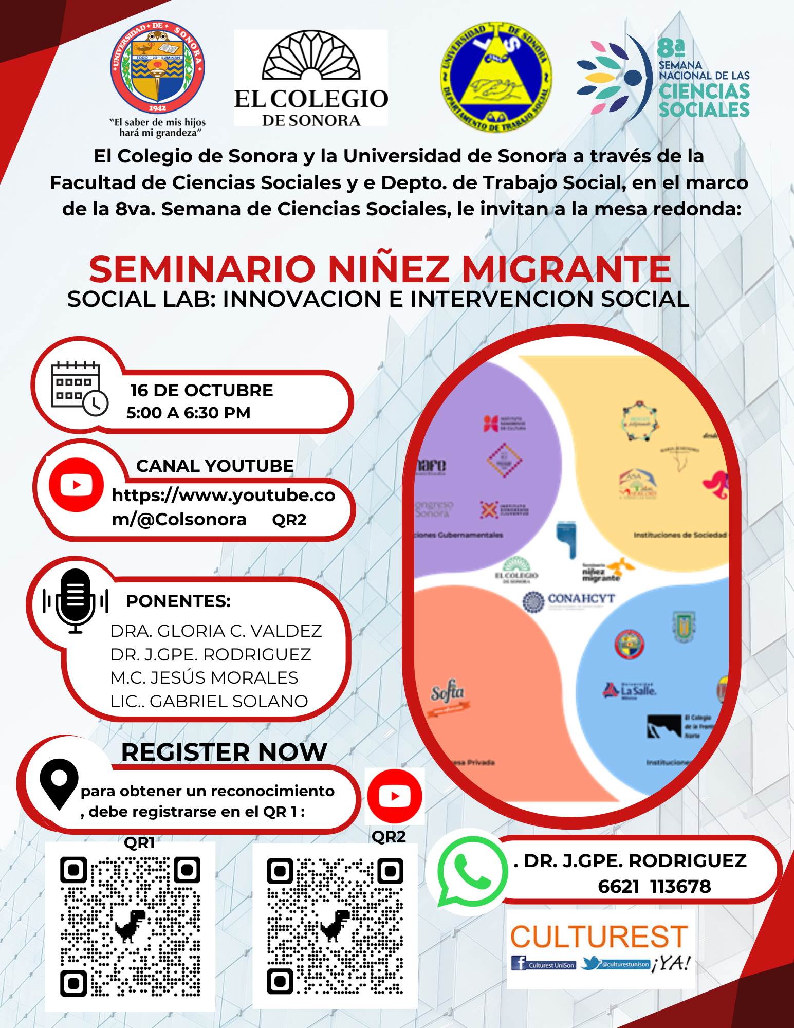 Una de las últimas tendencias para resolver problemas sociales complejos son los laboratorios de innovación social, ya que permiten la colaboración entre el sector privado, el sector académico, el sector gubernamental y la sociedad civil. El Seminario de Niñez Migrante-SNM- (https://www.facebook.com/seminario.ninezmigrante/) es un espacio de innovación e intervención social fundado en el año 2007, por la Dra. Gloria Ciria Valdez Gardea de El Colegio de Sonora. El objetivo general del conversatorio es compartir aspectos metodológicos y epistemológicos del conjunto de buenas prácticas de intervención social, gestionadas en los 18 años de experiencia en la investigación-acción del Seminario.