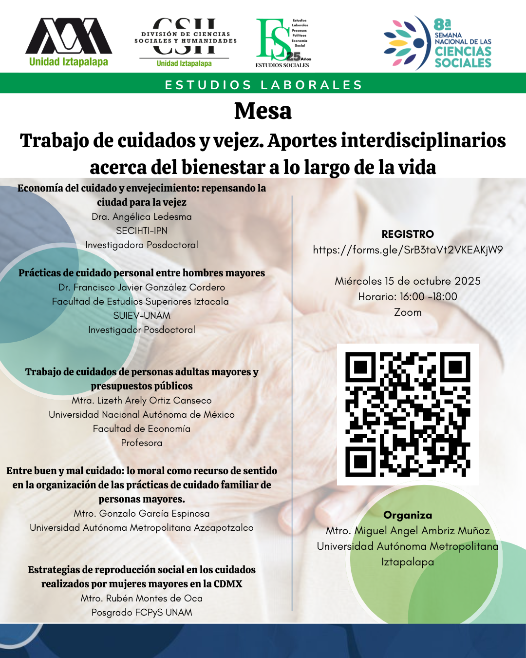 Esta mesa de discusión tiene el propósito de articular reflexiones alrededor de los cuidados y bienestar a través de un dialogo interdisciplinario llevado de la mano por estudiantes y académicos interesados en la construcción de andamiajes hacia la construcción de condiciones que promuevan el bienestar en la población adulta mayor. Este espacio es una oportunidad para exponer intereses académicos en la tarea de contruir canales de comunicación con personas involucradas en actividades de cuidados en diferentes niveles.