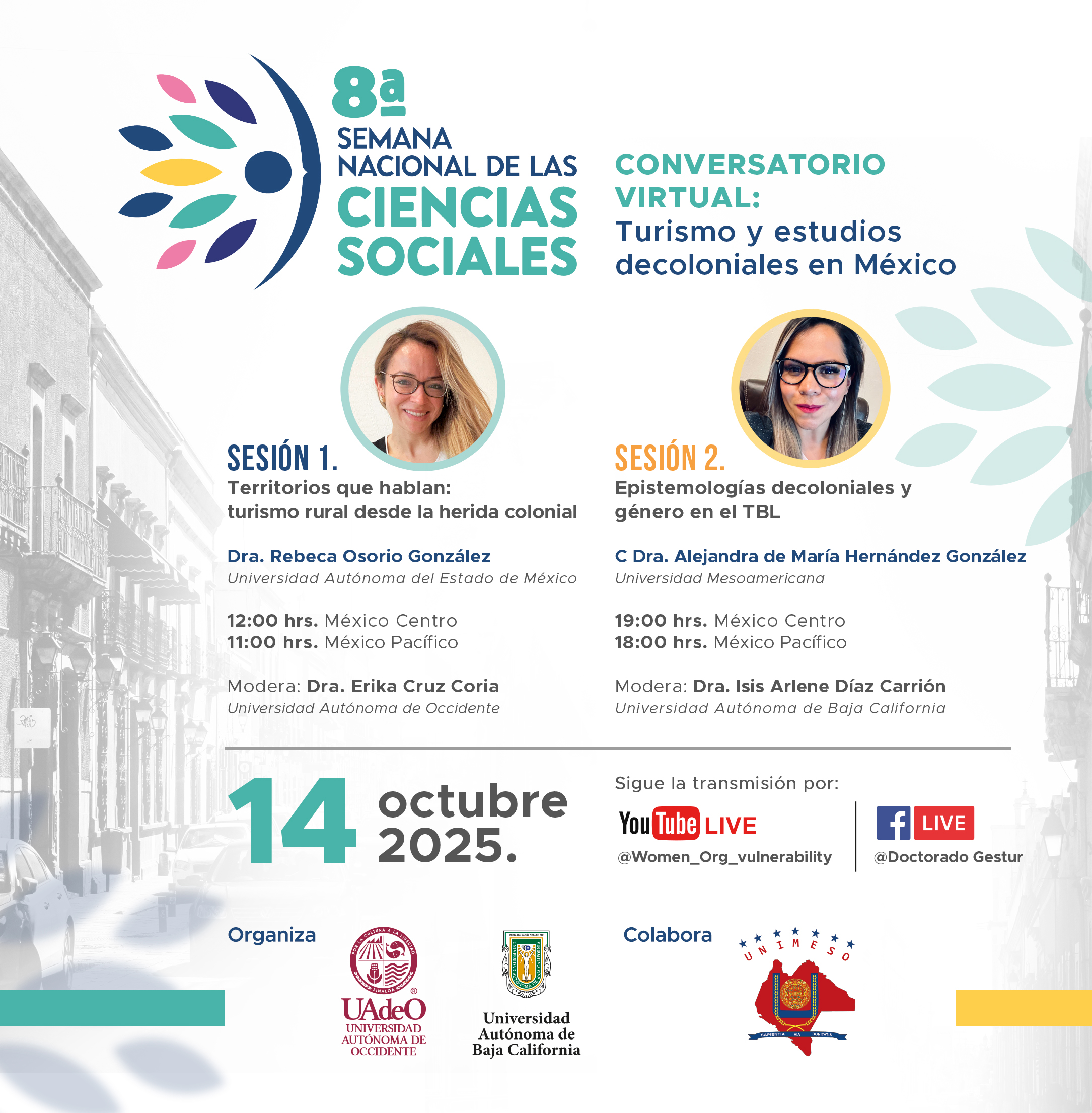 En el marco de la 8a Semana Nacional de las Ciencias Sociales a realizarse, del 13 al 17 de octubre, 2025, se propone un conversatorio virtual, organizado conjuntamente por la Universidad Autónoma de Baja California y la Universidad Autónoma de Occidente, con la colaboración de la Universidad Mesoamericana.