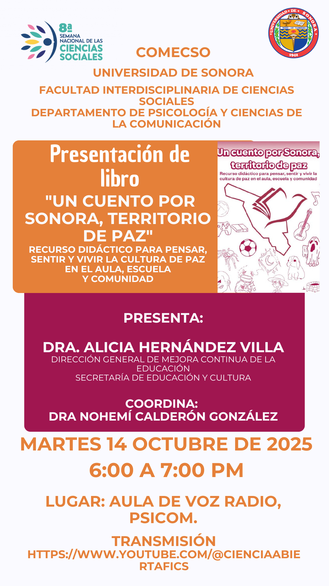 Se llevará a cabo la presentación del libro “Un cuento por Sonora, territorio de paz”, una obra colectiva que reúne la creatividad y el talento literario de estudiantes de educación básica y media superior, provenientes de escuelas públicas y privadas del estado de Sonora. Este proyecto editorial busca promover la escritura como una herramienta de expresión, identidad y construcción de paz, a través de relatos originales que reflejan la visión, sensibilidad y aspiraciones de niñas, niños y jóvenes sonorenses. Durante el evento se compartirá la experiencia de gestar esta iniciativa y se obsequiarán algunos ejemplares.