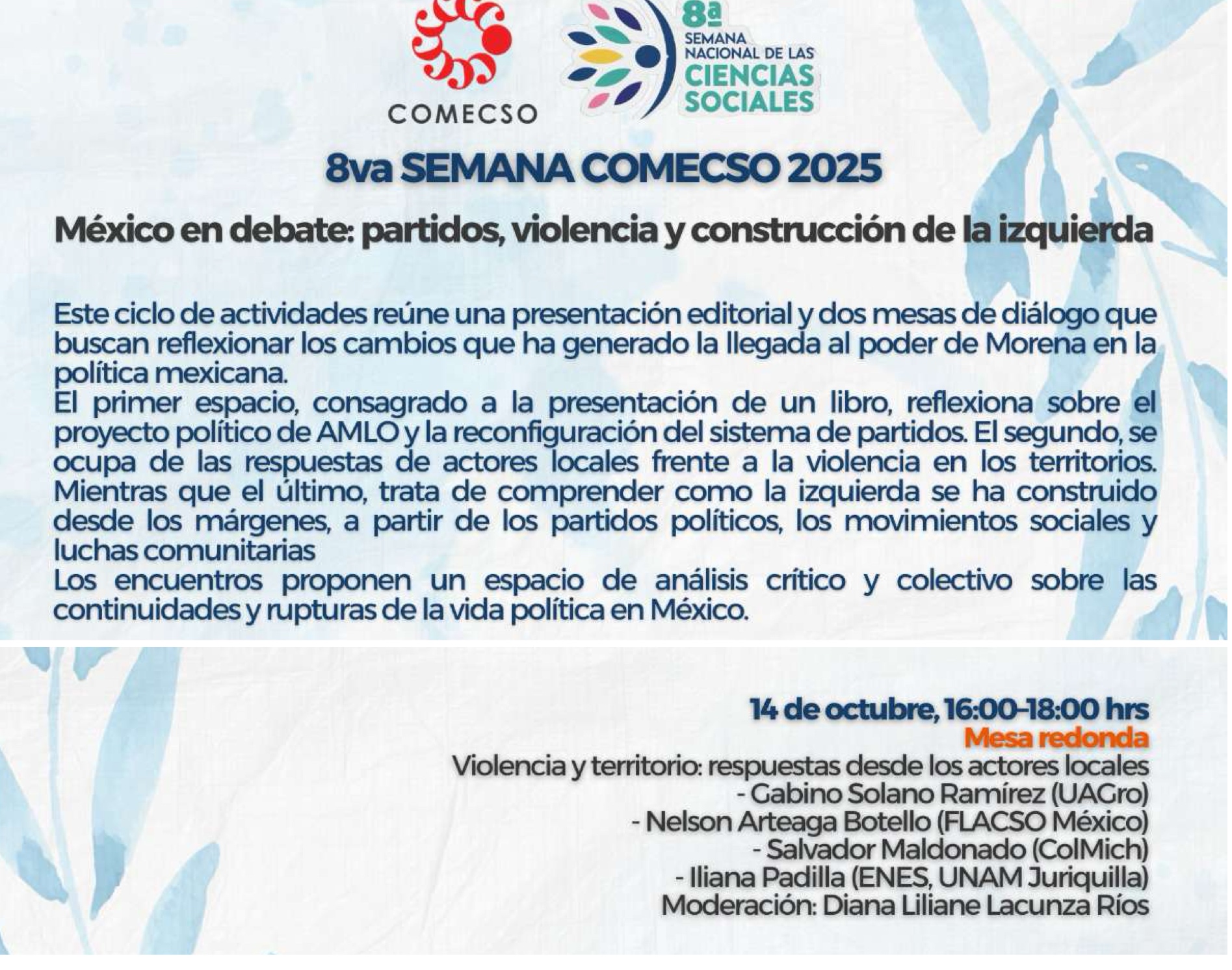 Esta mesa reflexiona sobre las estrategias que actores políticos y sociales implementan en contextos locales donde la violencia se vive, significa, gestiona y confronta cotidianamente. Se analizan las tensiones entre Estado, representación política y participación ciudadana frente a violencias que atraviesan la vida habitual de los territorios subnacionales. El diálogo abordará experiencias y prácticas que permiten comprender cómo se enfrentan y transforman las dinámicas violentas desde lo local, aportando claves para fortalecer resiliencias comunitarias y repensar las respuestas institucionales. Forma parte del evento: México en debate: partidos, violencia y construcción de la izquierda.