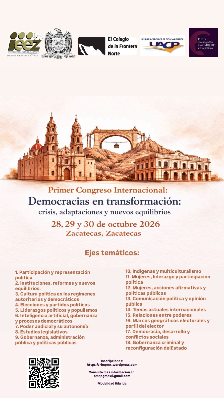 Este primer Congreso es convocado por la Red de Investigación sobre Mujeres en la Política, la Universidad Autónoma de Zacatecas y el Instituto Electoral del Estado de Zacatecas. Tiene como objetivo reunir a personas investigadoras, estudiantes de posgrado, especialistas, funcionariado público y actores de la sociedad civil interesados en el estudio de los procesos políticos contemporáneos, con el propósito de generar un foro de discusión sobre los desafíos actuales de la democracia, las transformaciones de la representación política, el impacto de la tecnología en la vida pública, la emergencia de nuevas agendas de derechos y los reequilibrios institucionales que están configurando el presente y el futuro de la democracia.