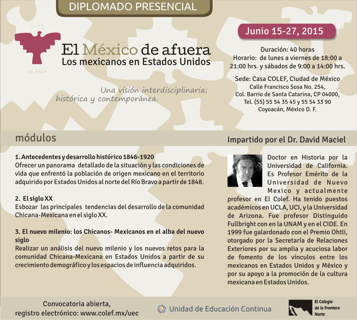 El Colegio de la Frontera Norte, a través de la Unidad de Educación Continua, convoca al diplomado presencial El México de Afuera, Los mexicanos en Estados Unidos, el cual se impartirá del 15 al 27 de junio.