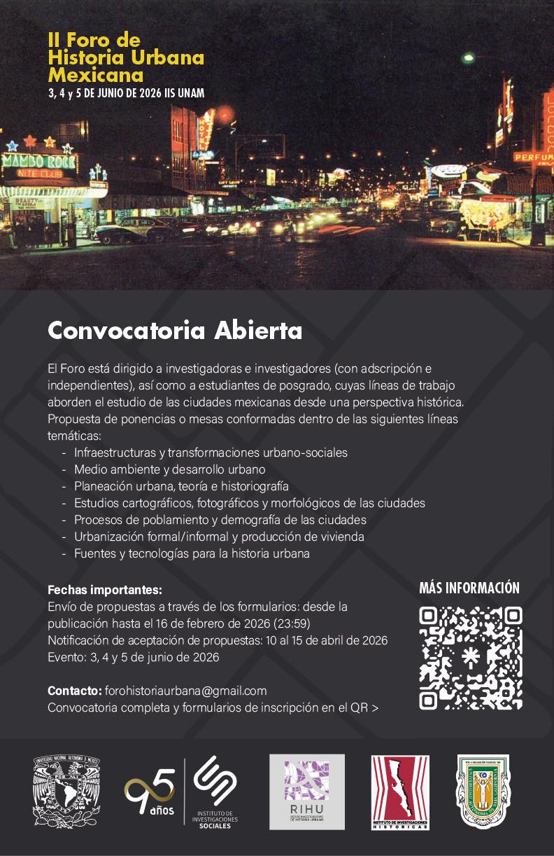 La Red de Investigadoras en Historia Urbana y el Instituto de Investigaciones Sociales (IIS) de la UNAM, en colaboración con el Instituto de Investigaciones Históricas de la Universidad Autónoma de Baja California, convocan a la segunda edición del Foro de Historia Urbana Mexicana, que se llevará a cabo los días 3, 4 y 5 de junio de 2026 en las instalaciones del IIS-UNAM.