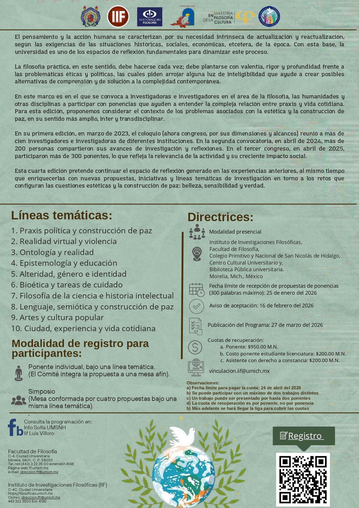 El Instituto de Investigaciones Filosóficas «Luis Villoro Toranzo» y la Facultad de Filosofía “Dr. Samuel Ramos Magaña” de la Universidad Michoacana de San Nicolás de Hidalgo convocan al IV Congreso Internacional de Filosofía Praxis y vida cotidiana. La paz por venir: belleza, sensibilidad y verdad, a realizarse de manera presencial los días 28, 29 y 30 de abril de 2026 en Morelia, Michoacán, México.