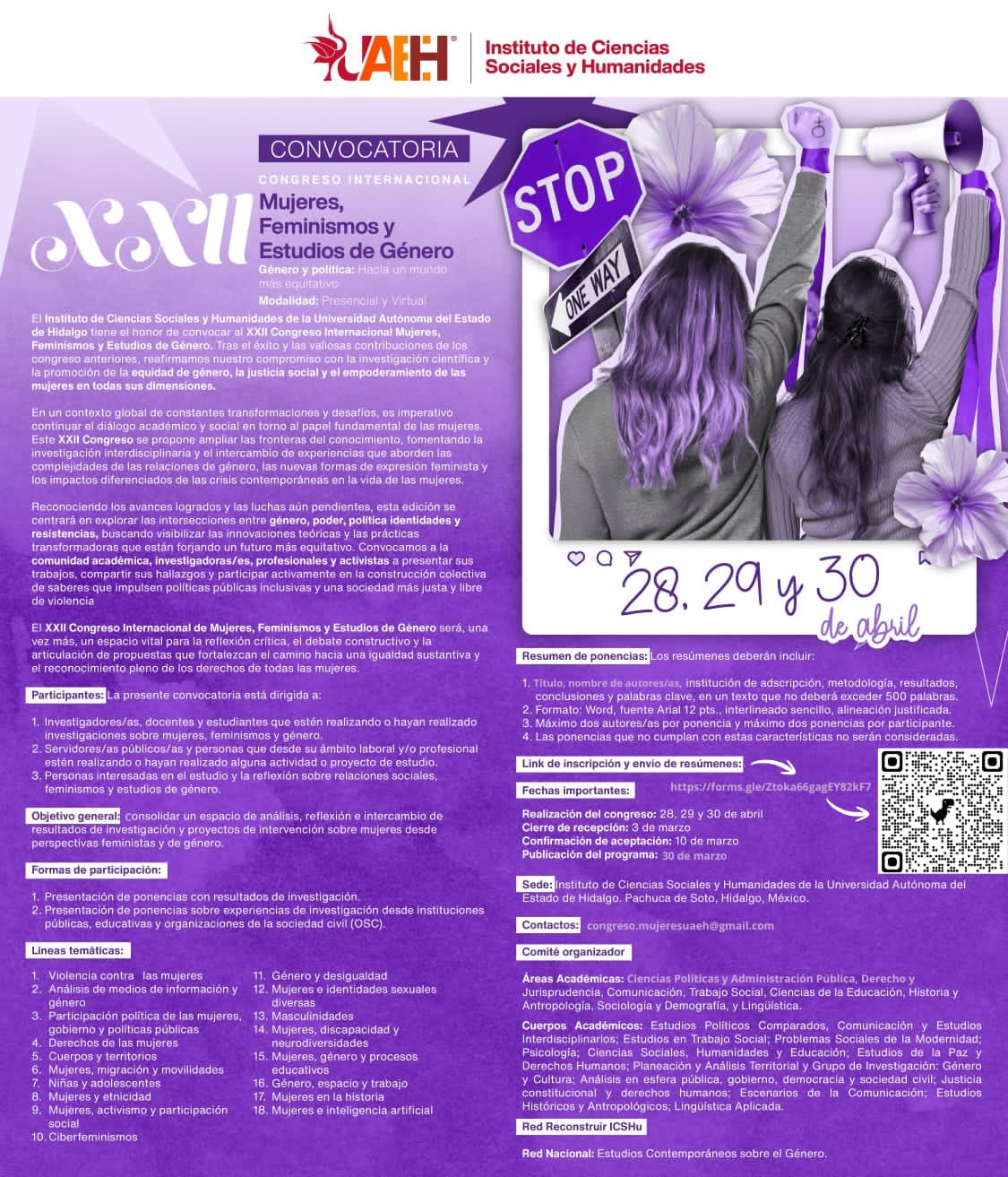 El Instituto de Ciencias Sociales y Humanidades de la Universidad Autónoma del Estado de Hidalgo tiene el honor de convocar al XXII Congreso Internacional Mujeres, Feminismos y Estudios de Género. Tras el éxito y las valiosas contribuciones de los congresos anteriores, reafirmamos nuestro compromiso con la investigación científica y la promoción de la equidad de género, la justicia social y el empoderamiento de las mujeres en todas sus dimensiones.