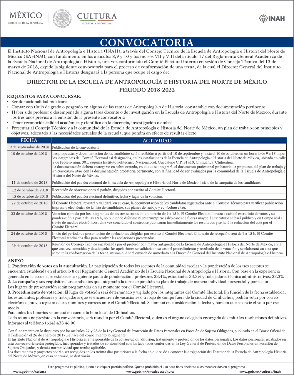 El Instituto Nacional de Antropología e Historia (INAH), a través del Consejo Técnico de la Escuela de Antropología e Historia del Norte de México (EAHNM), con fundamento en los artículos 8, 9 y 10 y los incisos VII y VIII del artículo 17 del Reglamento General Académico de la Escuela Nacional de Antropología e Historia, una vez conformado el Comité Electoral interno en sesión de Consejo Técnico del 13 de marzo de 201 8, expide la siguiente convocatoria para el proceso de conformación de una terna, de la cual el Director General del Instituto Nacional de Antropología e Historia designará a la persona que ocupe el cargo de:
