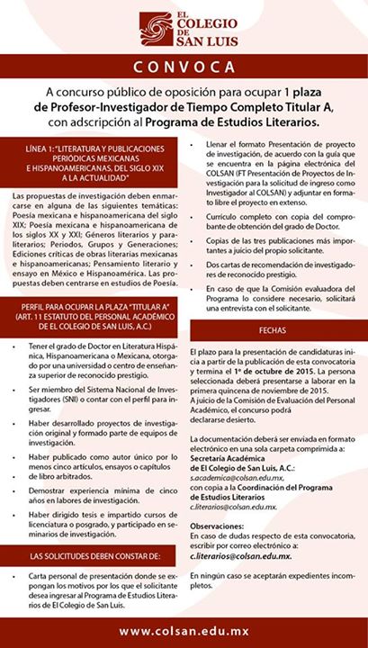 El Colegio de San Luis (COLSAN), convoca a profesionales que cuenten con algún doctorado en Literatura Hispánica, Hispanoamericana o Mexicana, a participar en su concurso de oposición para ocupar 1 plaza de profesor-investigador de tiempo completo titular A, con adscripción al Programa de Estudios Literarios.