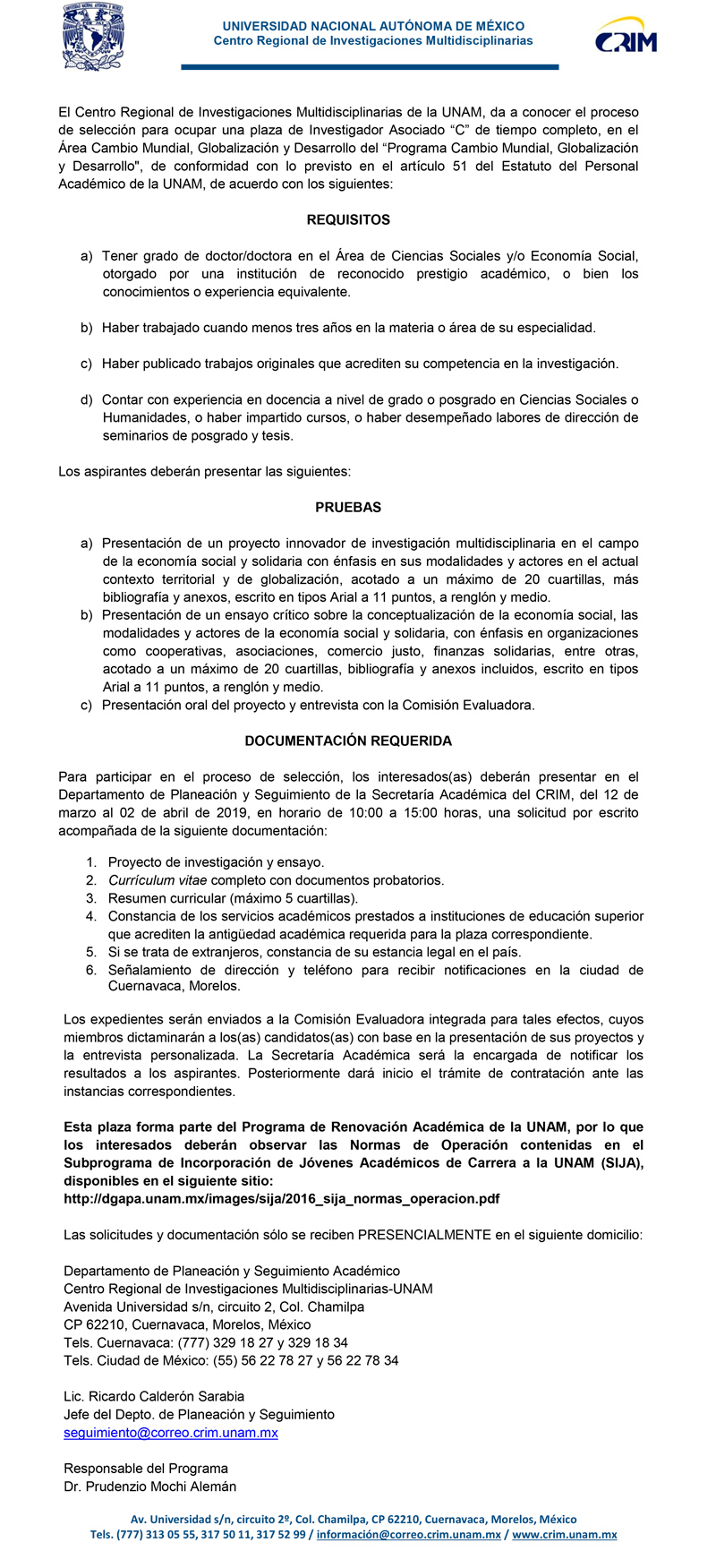El Centro Regional de Investigaciones Multidisciplinarias de la UNAM, da a conocer el proceso de selección para ocupar una plaza de Investigador Asociado «C» de tiempo completo, en el Área Cambio Mundial, Globalización y Desarrollo del «Programa Cambio Mundial, Globalización y Desarrollo», de conformidad con lo previsto en el artículo 51 del Estatuto del Personal Académico de la UNAM, de acuerdo con los siguientes:
