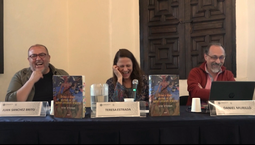 Juan Sánchez Brito, Tere Estrada y Daniel Murillo en la presentación del libro Sirenas al ataque, 5 de febrero del 2024, en la Casa Chata del CIESAS. Fotograma del video grabado por el Laboratorio Audiovisual del CIESAS