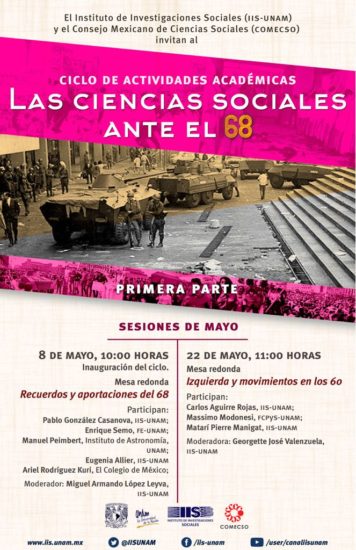 El Instituto de Investigaciones Sociales (IIS-UNAM) y el Consejo Mexicano de Ciencias Sociales (COMECSO) invitan al Ciclo de actividades académicas: Las Ciencias Sociales ante el 68 Sesiones…